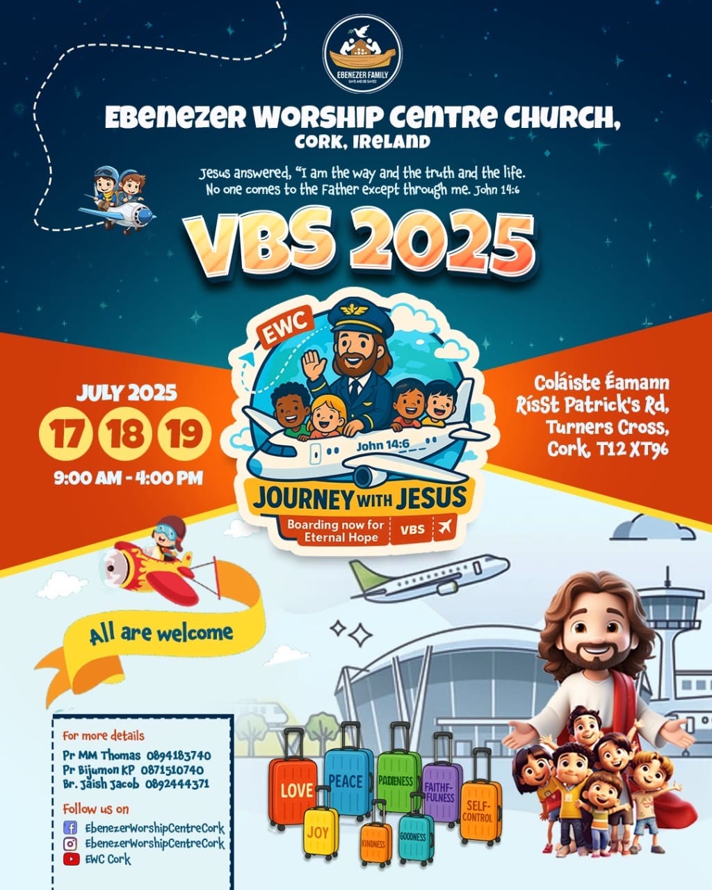 അയർലൻഡ്: ഏബേനസർ കോർക്ക് ദൈവസഭയുടെ ആഭിമുഖ്യത്തിൽ ജൂലൈ 17 മുതൽ 19 വരെ വെക്കേഷൻ ബൈബിൾ ക്ലാസ്സ്‌ നടക്കും. ദിവസവും രാവിലെ ഒമ്പതിന് ആരംഭിച്ച് വൈകിട്ട്‌ മൂന്നിന് സമാപിക്കും.