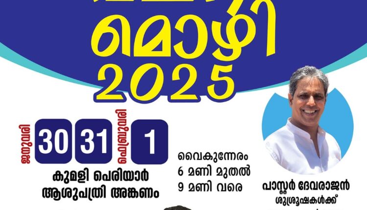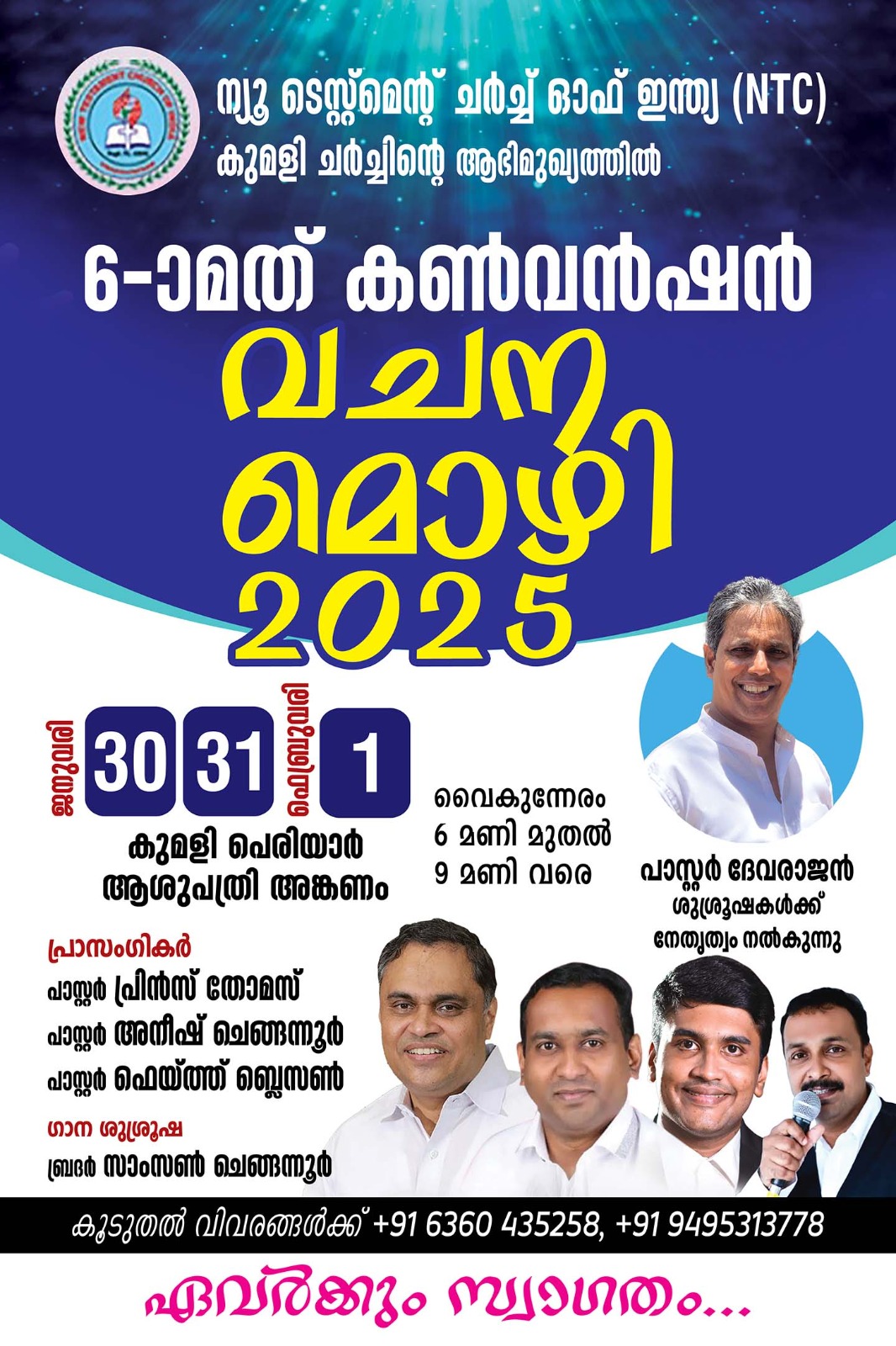 കുമളി : ന്യൂടെസ്റ്റ്മെന്റ് ചർച്ച് ഓഫ് ഇന്ത്യ (എൻടിസി) കുമളി ചർച്ചിന്റെ ആഭിമുഖ്യത്തിൽ 2025 ജനുവരി 30 മുതൽ ഫെബ്രുവരി 1 വരെ കുമളി പെരിയാർ ഹോസ്പിറ്റൽ അങ്കണത്തിൽ വൈകിട്ട് 6 മുതൽ 9 വരെ “വചനമൊഴി 2025” 6-ാമത് കൺവൻഷൻ നടക്കും.