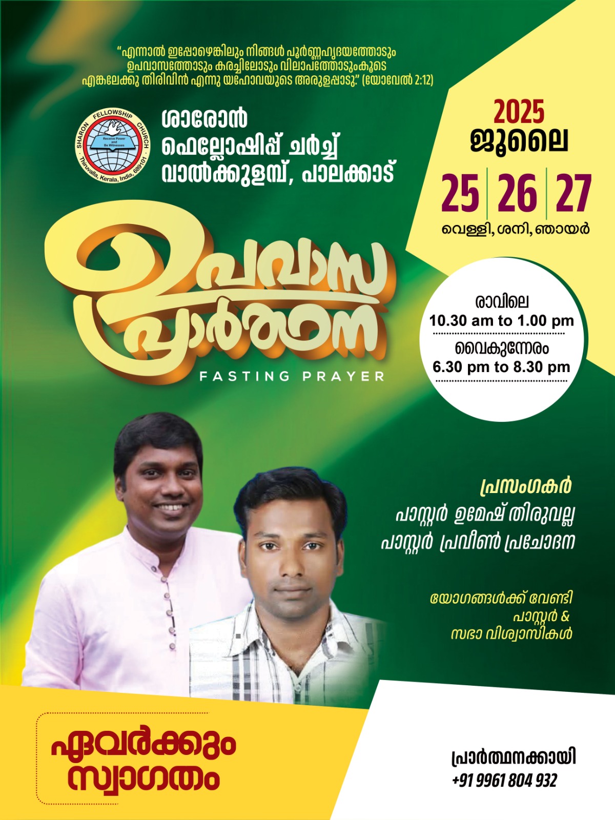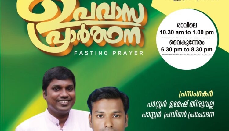 പാലക്കാട്:വാൽക്കുളമ്പ് ശാരോൻ ഫെല്ലോഷിപ്പ് ചർച്ചിന്റെ ആഭിമുഖ്യത്തിൽ ജൂലൈ 25, 26,37 തിയതികളിൽ ഉപവാസ പ്രാർത്ഥന നടക്കും. രാവിലെ 10.30 നും രാത്രി 6.30 നും നടക്കുന്ന യോഗത്തിൽ പാസ്റ്റർമാരായ ഉമേഷ് തിരുവല്ല, പ്രവീൺ പ്രചോദന എന്നിവർ ദൈവവചനം ശുശ്രൂഷിക്കും