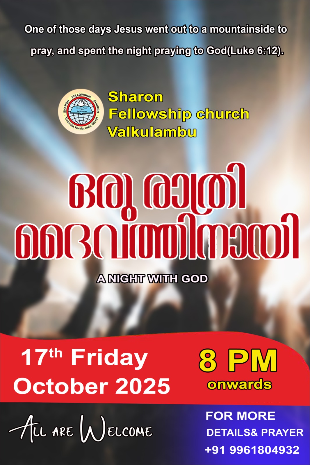 വാൽക്കുളമ്പ് ശാരോൻ ചർച്ച് 4-ാമത് മുഴുരാത്രി പ്രാർത്ഥന ChristianNews On Oct 16, 2025 626 പാലക്കാട് : വാൽക്കുളമ്പ് ശാരോൻ ഫെല്ലോഷിപ്പ് ചർച്ചിന്റെ ആഭിമുഖ്യത്തിൽ ഒക്ടോബർ 17 ന് മുഴുരാത്രി പ്രാർത്ഥന നടക്കും. രാത്രി 8 മണിക്ക് തുടങ്ങുന്ന യോഗത്തിന് പാസ്റ്റർ പ്രവീൺ പ്രചോദന നേതൃത്വം നൽകും. 626 Share