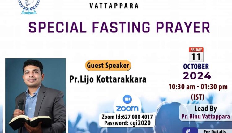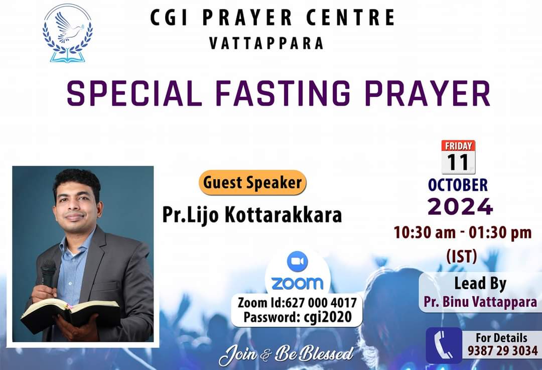 വട്ടപ്പാറ സിജിഐ പ്രയർ സെന്റർ സ്പെഷ്യൽ ഫാസ്റ്റിംഗ് പ്രയർ ChristianNews Last updated Oct 7, 2024 45 വട്ടപ്പാറ : വട്ടപ്പാറ സിജിഐ പ്രയർ സെന്ററിന്റെ ആഭിമുഖ്യത്തിൽ വെള്ളിയാഴ്ച (october 11) പ്രയർ സെന്ററിൽ സ്പെഷ്യൽ ഫാസ്റ്റിംഗ് പ്രയർ നടക്കും. പാ. ലിജോ കൊട്ടാരക്കര പ്രസംഗിക്കും. പാ. ബിനു വട്ടപ്പാറ നേതൃത്വം നൽകും. 45 Share
