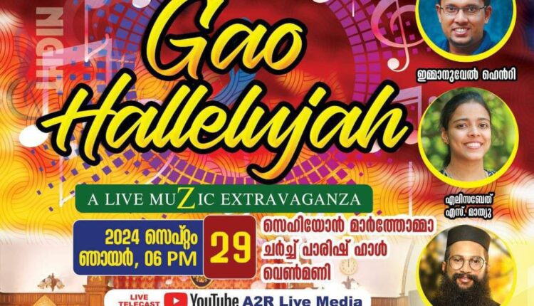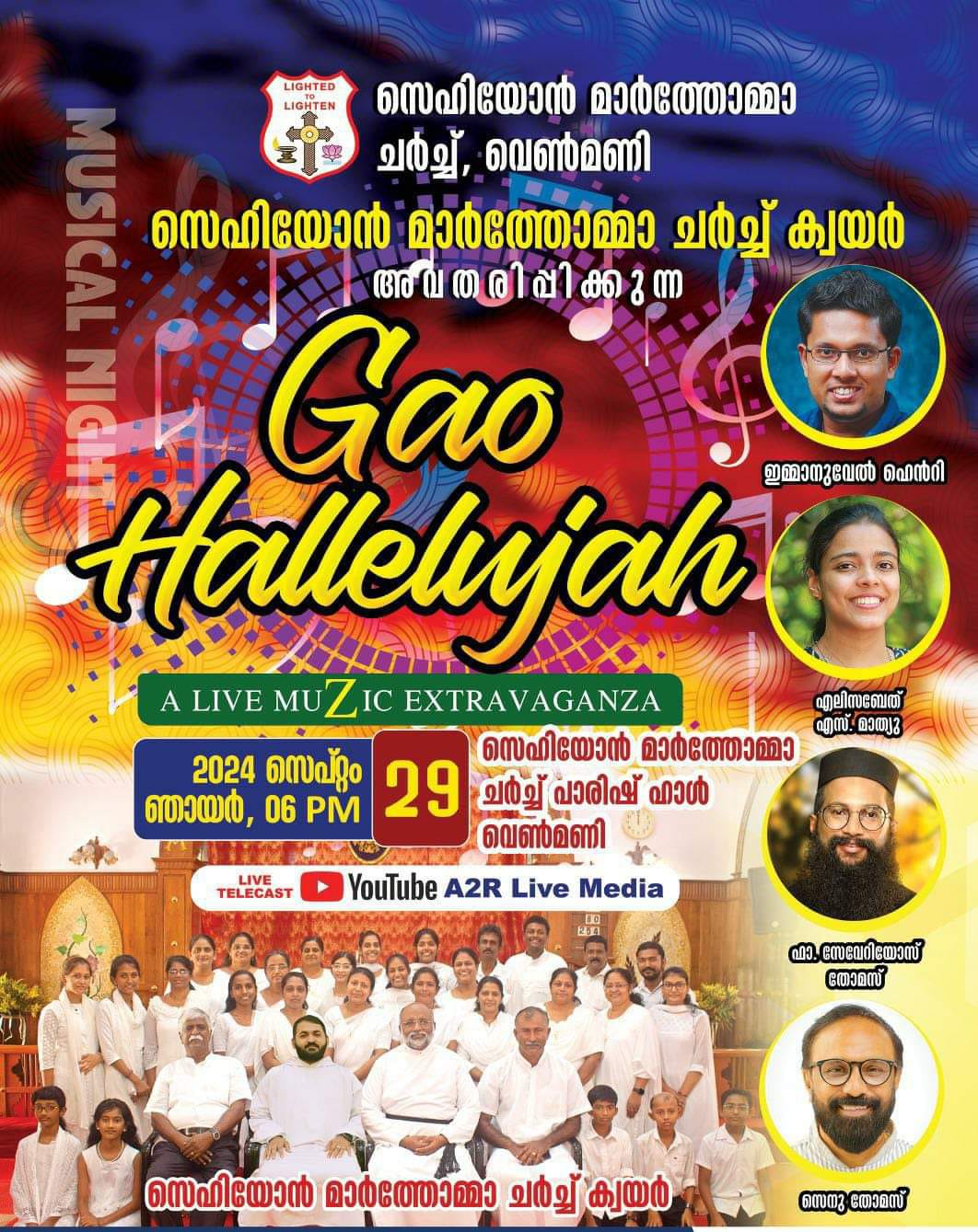 വെൺമണി : വെൺമണി സെഹിയോൺ മാർത്തോമാ ചർച്ച് ക്വയറിന്റെ ആഭിമുഖ്യത്തിൽ സെപ്റ്റംബർ 29 ന് വെൺമണി ചർച്ച് പാരിഷ് ഹാളിൽ ഗാഒ ഹല്ലേലൂയ ലൈവ് മ്യൂസിക് എക്സ്ട്രാവാഗൻസ നടക്കും. ഇമ്മാനുവേൽ ഹെൻറി, എലിസബേത് എസ്. മാത്യു, ഫാ. സേവേറിയോസ് തോമസ്, സെനു തോമസ് പ്രോഗ്രാം നയിക്കും.