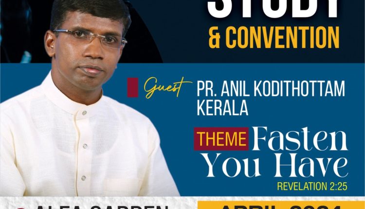ഡൽഹി: വെസ്റ്റ് ഡൽഹിയിലുള്ള പെന്തെക്കോസ്തു സഭകളുടെ സംയുക്ത വേദിയായ വെസ്റ്റ് ഡൽഹി പെന്തെക്കോസ്തൽ ഫെല്ലോഷിപ്പിന്റെ ആഭിമുഖ്യത്തിൽ ഏപ്രിൽ 11-14 വരെ കരോൾബാഗ് ആൽഫ ഗാർഡനിൽ വച്ച് ബൈബിൾ സ്റ്റഡിയും കൺവൻഷനും നടക്കും. രാവിലെ 10നു ബൈബിൾ സ്റ്റഡിയും വൈകിട്ട് 6നു കൺവൻഷനുമായിരിക്കും. പാസ്റ്റർ അനിൽ കൊടിത്തോട്ടം മുഖ്യ പ്രഭാഷകനായിരിക്കും. “നിനക്കുള്ളത് മുറികെ പിടിക്ക” എന്നതാണ് ചിന്താവിഷയം. പാസ്റ്റർ അജി മാത്യു, ബ്രദർ സാബു മത്തായി, ബ്രദർ ബി എൻ ദാസ് തുടങ്ങിയവർ നേതൃത്വം നൽകും.
