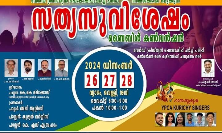 കോട്ടയം : വേൾഡ് ക്രിസ്‌ത്യൻ ഫെലോഷിപ്പ് ചർച്ചിന്റെ ആഭിമുഖ്യത്തിൽ ഡിസംബർ 26 മുതൽ 28 വരെ കുഴിവേലിപ്പടി ചാലുകണ്ടം നഗർ പരിപ്പ് വേൾഡ് ക്രിസ്‌ത്യൻ ഫെലോഷിപ്പ് ചർച്ചിൽ സത്യസുവിശേഷം ബൈബിൾ കൺവൻഷൻ നടക്കും.
