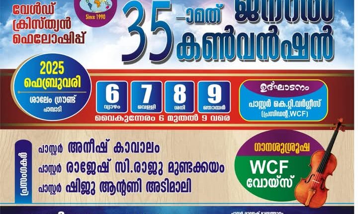 പാമ്പാടി : വേൾഡ് ക്രിസ്ത്യൻ ഫെലോഷിപ്പിന്റെ ആഭിമുഖ്യത്തിൽ ഫെബ്രുവരി 6 മുതൽ 9 വരെ പാമ്പാടി ശാലേം ഗ്രൗണ്ടിൽ 35 -മത് ജനറൽ കൺവെൻഷൻ നടക്കും.