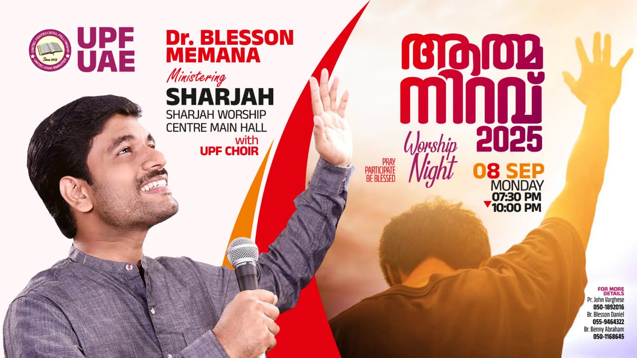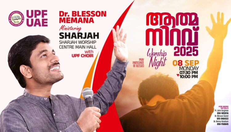 ഷാർജ:യുണൈറ്റഡ് പെന്തക്കോസ്തൽ ഫെലോഷിപ് യു എ ഇ യുടെ ആഭിമുഖ്യത്തിൽ ഡോ.ബ്ലെസൻ മേമന നയിക്കുന്ന വർഷിപ് നൈറ്റ് “ആത്മനിറവ് 2025” സെപ്റ്റംബർ 8 തിങ്കളാഴ്ച നടക്കും. രാത്രി 07:30 മുതൽ 10:30 വരെ ഷാർജ വർഷിപ് സെൻ്റർ മെയിൻ ഹാളിൽ നടക്കുന്ന യോഗത്തിൽ യു പി എഫ് ക്വയറും പങ്ക് ചേരും.യു പി എഫ് എക്സിക്യുട്ടീവ് കമ്മറ്റി നേതൃത്വം നൽകും.