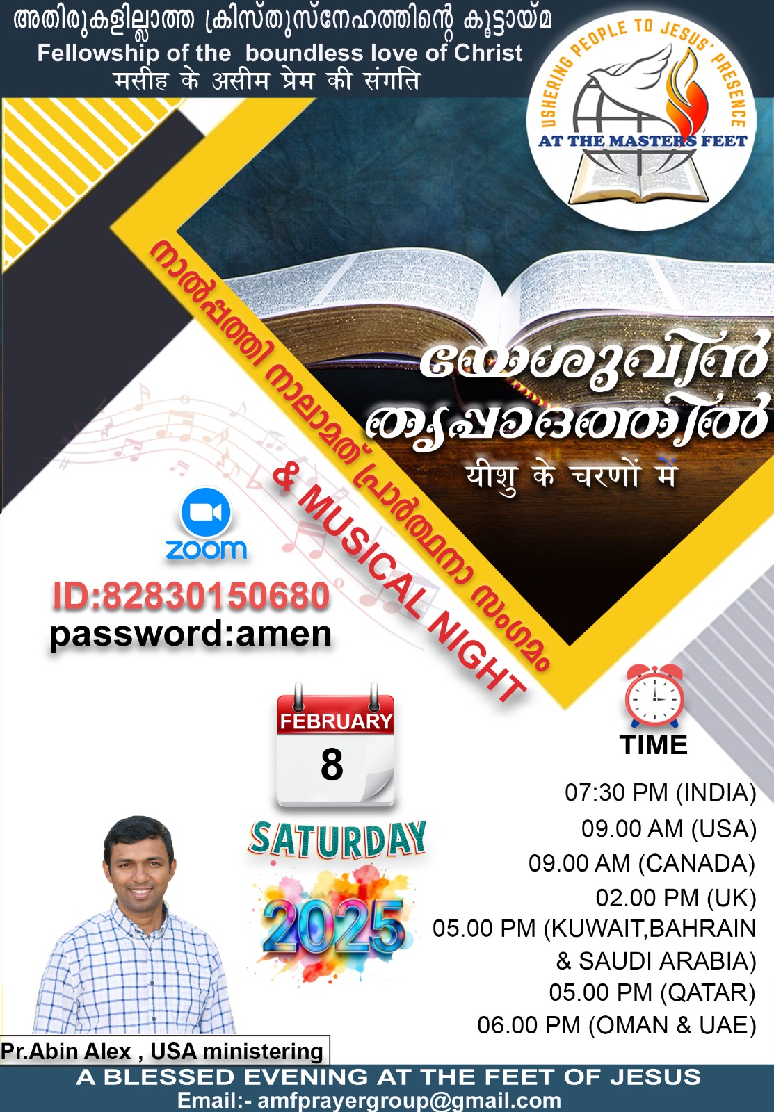പ്രസിദ്ധ ക്രൈസ്തവ ഗായകനായ പാസ്റ്റർ. എബിൻ അലക്സ്, USA നയിക്കുന്ന സംഗീത ശുശ്രൂഷയും,തൻറെ അനുഭവങ്ങളും മുഖ്യ സന്ദേശവും നൽകുന്നു. 2021 ജൂലൈ മുതൽ ആരംഭിച്ച യേശുവിൻ തൃപ്പാദത്തിൽ സൂം മീഡിയയിലൂടെ സംഘടിപ്പിച്ചുവരുന്നത്. മുടക്കം കൂടാതെ എല്ലാ മാസങ്ങളിലും നടന്നുവരുന്ന ഈ പ്രോഗ്രാമിലൂടെ ലോകമെമ്പാടുമുള്ള മലയാളികൾ ക്രിസ്തുവിനെ അറിയുവാൻ ഒരു മുഖാന്തിരമായി ഇതിന്റെ പ്രവർത്തനങ്ങൾ നടന്നു വരുന്നു.