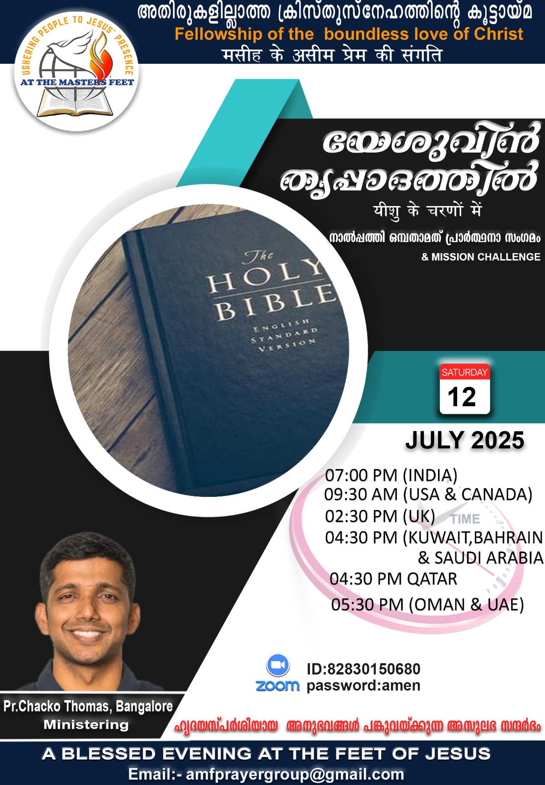 ദൈവവചനം അതിരുകളില്ലാതെ എല്ലാവരിലേക്കും എത്തിക്കുക എന്ന ലക്ഷ്യത്തോടെ സംഘടിപ്പിക്കുന്ന ”യേശുവിൻ തൃപ്പാദത്തിൽ” നാൽപ്പത്തി ഒൻപതാമത് പ്രാർത്ഥനാ സംഗമവും മിഷൻ ചലഞ്ചും ജൂലൈ 12 ശനിയാഴ്ച രാത്രി 7.00ന് (ഇന്ത്യൻ സമയം) ഓൺലൈനിൽ നടക്കും.