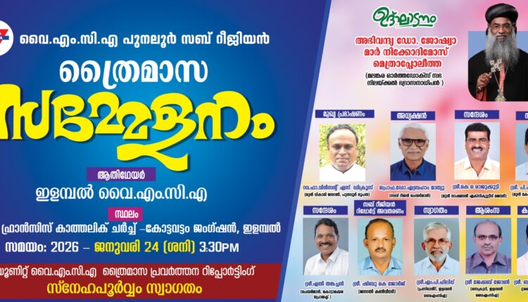 ഇളമ്പൽ: വൈഎംസിഎ പുനലൂർ സബ് റീജിയൻ സമ്മേളനം 24 ശനിയാഴ്ച 3.30ന് ഇളമ്പൽ കോട്ടവട്ടം ജംഗ്ഷൻ സെൻ്റ് ഫ്രാൻസിസ് കാത്തോലിക്കാ ദേവാലയത്തിൽ നടക്കും. മലങ്കര ഓർത്തഡോക്സ് സഭ നിലയ്ക്കൽ ഭദ്രാസനാധിപൻ ഡോ.ജോഷ്വാ മാർ നിക്കോദിമോസ് ഉദ്ഘാടനം ചെയ്യും.