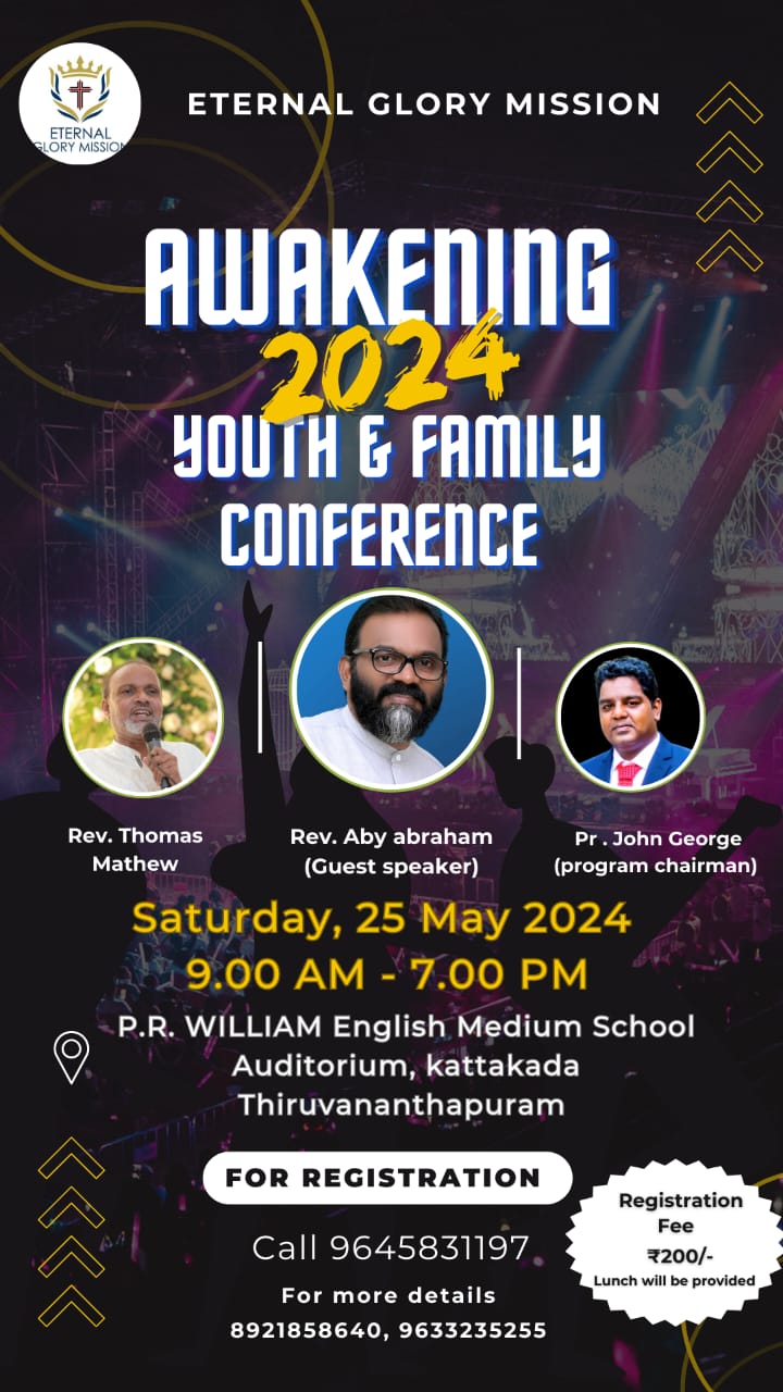 കാട്ടാക്കട : എറ്റേണൽ ഗ്ലോറി മിഷന്റെ ആഭിമുഖ്യത്തിൽ നാളെ രാവിലെ 9 മണി മുതൽ വൈകിട്ട് 7 മണി വരെ കാട്ടാക്കട പി.ആർ വില്യം ഇംഗ്ലീഷ് മീഡിയം സ്കൂൾ ഓഡിറ്റോറിയത്തിൽ യൂത്ത് ആൻഡ് ഫാമിലി കോൺഫ്രൻസ് നടക്കുന്നു. റെവ എബി എബ്രഹാം, സിസ്റ്റർ. റിനിതോമസ് എന്നിവർ ക്ലാസുകൾ നയിക്കുന്നു. രക്ഷ, സ്നാനം,പരിശുദ്ധത്മാഭിഷേകം,കൂട്ടായ്മ, വചനപഠനം, കൗൺസിലിംഗ്,ആത്മനിറവിൽ ജീവിതം വിവിധ ആത്മീയ വിഷയങ്ങളെ കുറിച്ചുള്ള ക്ലാസ്സുകളാണ് ക്രമീകരിച്ചിരിക്കുന്നത്.