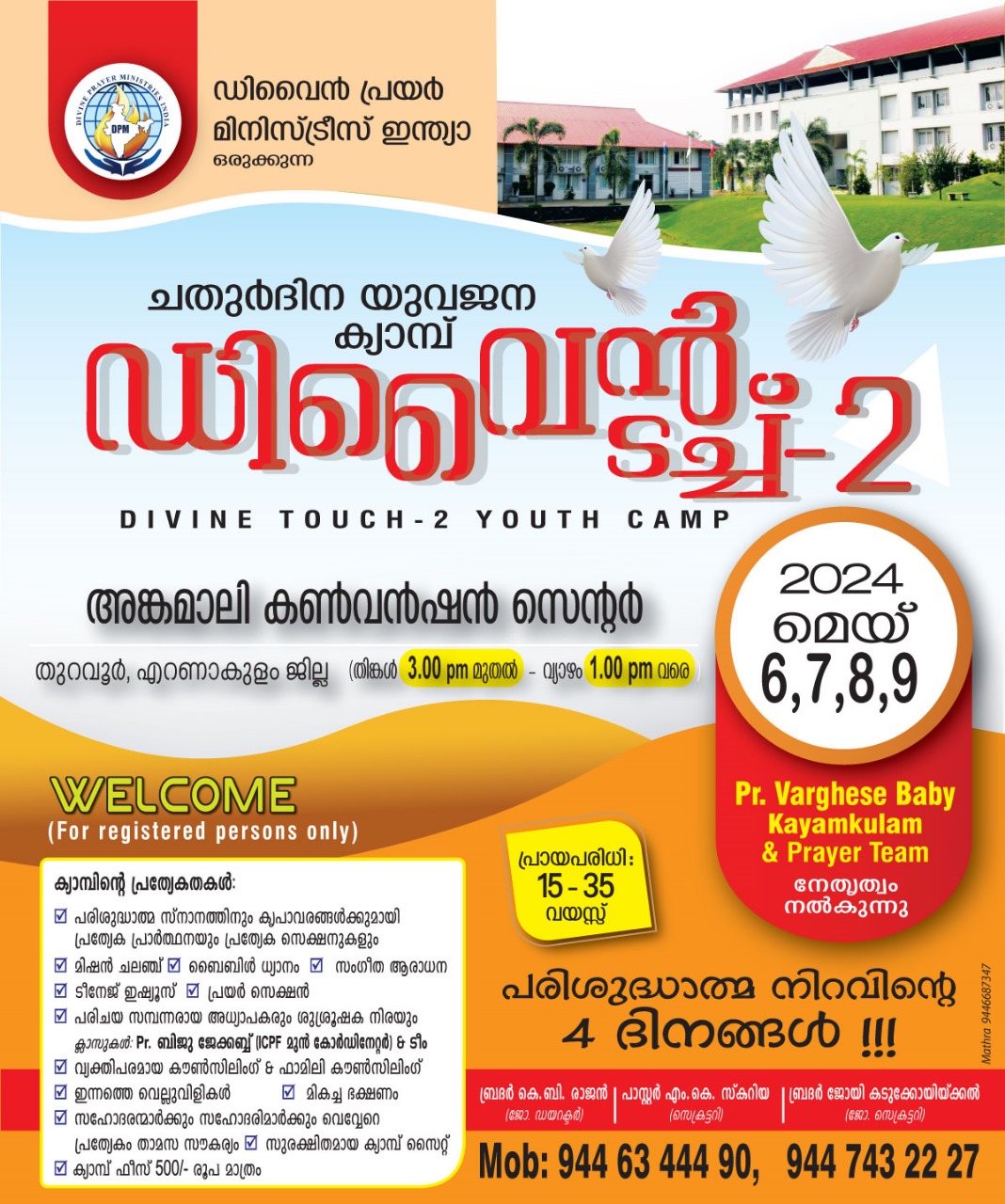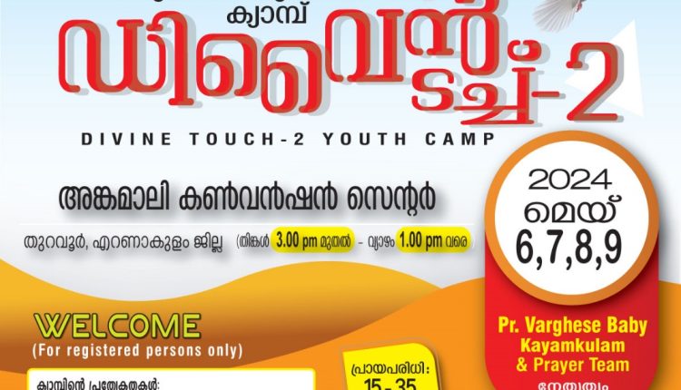 എറണാകുളം: അങ്കമാലി ഡിവൈൻ പ്രയർ മിനിസ്ട്രീസ് ഇന്ത്യയുടെ ചതുർദിന യുവജന ക്യാമ്പ് – ഡിവൈൻ ടച്ച് ഇന്ന് വൈകിട്ട് മൂന്നിന് അങ്കമാലി കൺവെൻഷൻ സെന്ററിൽ ആരംഭിക്കും ഓൺലൈനിൽ രജിസ്റ്റർ ചെയ്ത മൂന്നൂറ് പേർക്കാണ് പ്രവേശനം.