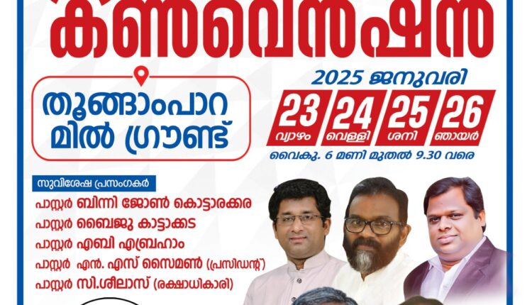 തൂങ്ങാംപാറ : ജനുവരി 23 മുതൽ 26 വരെ തൂങ്ങാംപാറ മിൽ ഗ്രൗണ്ടിൽ സീയോൺ സംഘം 73 -മത് ജനറൽ കൺവെൻഷൻ നടക്കും. പാ. ബിന്നി ജോൺ, പാ. ബൈജു കാട്ടാക്കട, പാ. എബി എബ്രഹാം, പാ. എൻ എസ് സൈമൺ, പാ. സി ശീലാസ് എന്നിവർ പ്രസംഗിക്കും. സീയോൺ യൂത്ത് മൂവ്മെന്റ് ഗാന ശുശ്രൂഷ നിർവഹിക്കും.
