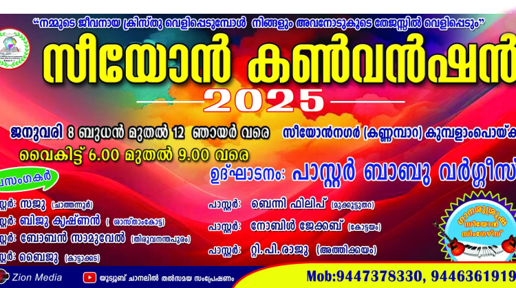 കണ്ണമ്പാറ : സീയോൻനഗർ (കണ്ണമ്പാറ) കുമ്പളാംപൊയ്കയിൽ ജനുവരി 8 മുതൽ 12 വരെ സീയോൻ കൺവെൻഷൻ നടക്കും. പാ. ബാബു വർഗീസ് ഉദ്ഘാടനം നിർവഹിക്കുന്ന യോഗത്തിൽ പാസ്റ്റർമാരായ സജു ചാത്തന്നൂർ, ബിജു കൃഷ്ണൻ, ബോബൻ സാമുവേൽ, ബൈജു, ബെന്നി ഫിലിപ്പ്, നോബിൾ ജോർജ്, റ്റി പി രാജു എന്നിവർ പ്രസംഗിക്കും. സീയോൻ സിംഗേഴ്സ് ഗാനശുശ്രൂഷ നിർവഹിക്കും.
