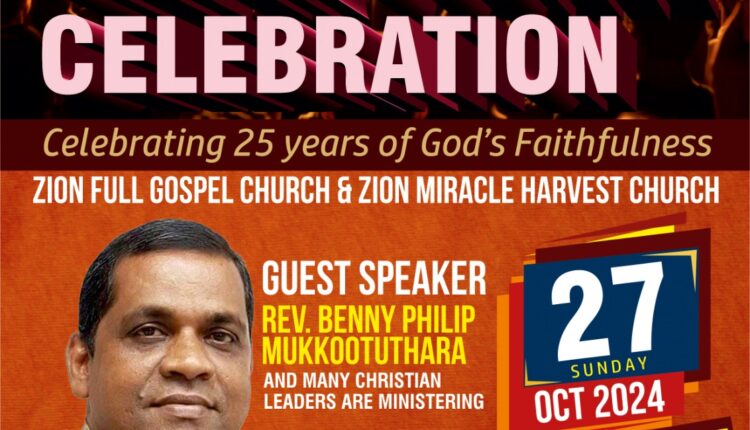 ബെംഗളൂരു : സയോൺ ഫുൾ ഗോസ്പൽ ചർച്ച് രജതജൂബിലി സമ്മേളനം ഇന്ന് ഗൊട്ടിഗരെ ചിക്കമ്മന്നഹളളി സയോൺ മിറാക്കിൾ ഹാർവെസ്റ്റ് ചർച്ച് ഹാളിൽ നടക്കും. വൈകിട്ട് അഞ്ചു മുതൽ നടക്കുന്ന ജൂബിലി സമ്മേളനത്തിൽ റവ. ബെന്നി ഫിലിപ്പ് മൂക്കൂട്ടുതറ മുഖ്യാതിഥി ആയിരിക്കും.